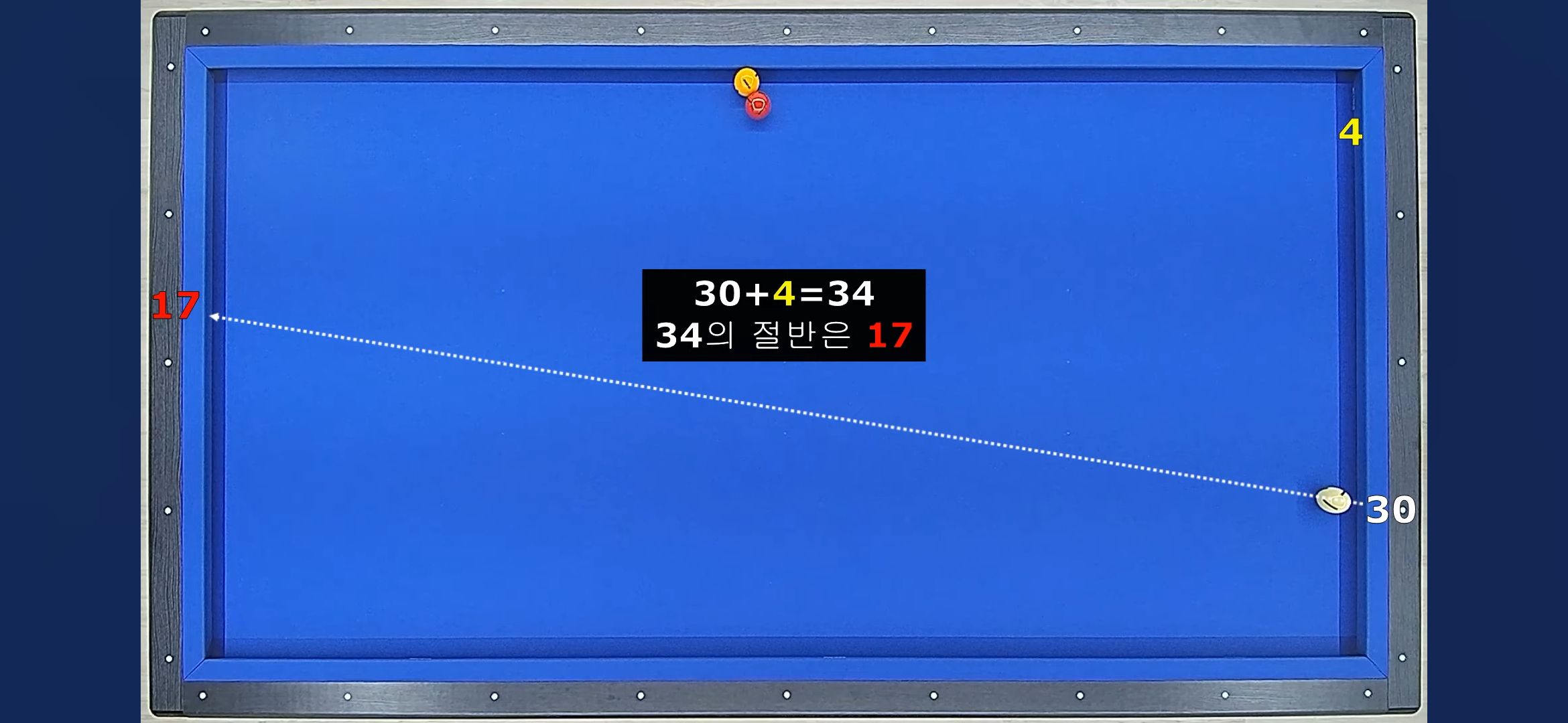 이 시스템의 핵심은 원쿠션 지점을 숫자로 특정하는 방식입니다. 기준은 한 칸당 10이고, 단축 코너에서 출발할 경우 수구의 출발값과 목적구가 도달할 투쿠션 값을 더한 다음 그 합의 절반을 찾으면 됩니다. 예를 들어 투쿠션 위치가 6이고 출발값이 40이라면, 합산 값 46의 절반인 23이 원쿠션 지점이 됩니다.
