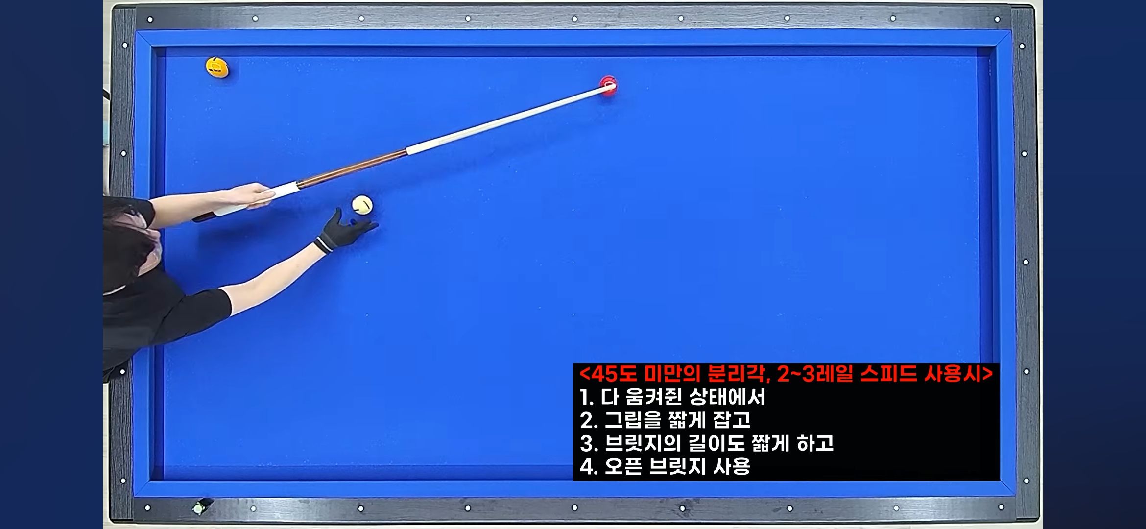 실전에서는 짧은 그립과 오픈 브릿지를 조합하여 연습하면 효과적입니다. 그립을 짧게 잡고 오픈 브리지를 짧게 한 상태로 45도 미만 분리각과 2 쿠션 정도 속도로 반복 연습하면, 손바닥이 들리지 않으면서도 힘이 빠진 상태를 자연스럽게 익힐 수 있습니다(출처: 국민체육진흥공단). 저는 이 방법으로 얇은 두께 연습을 꾸준히 하면서 스트로크가 단순해지고 실수가 확연히 줄어드는 걸 체감했습니다.