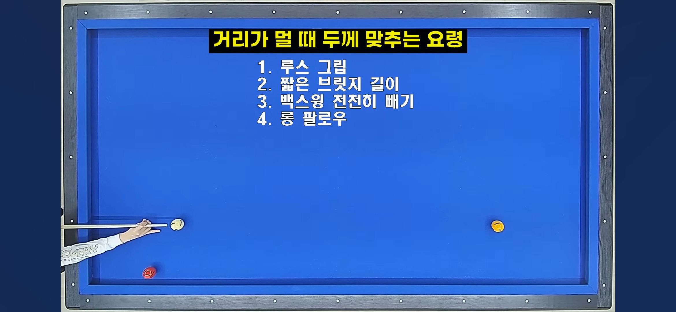 - 1 적구와 쿠션의 거리에 따라 팔로우 길이(롱/숏)와 브리지 길이를 반대 방향으로 맞춘다