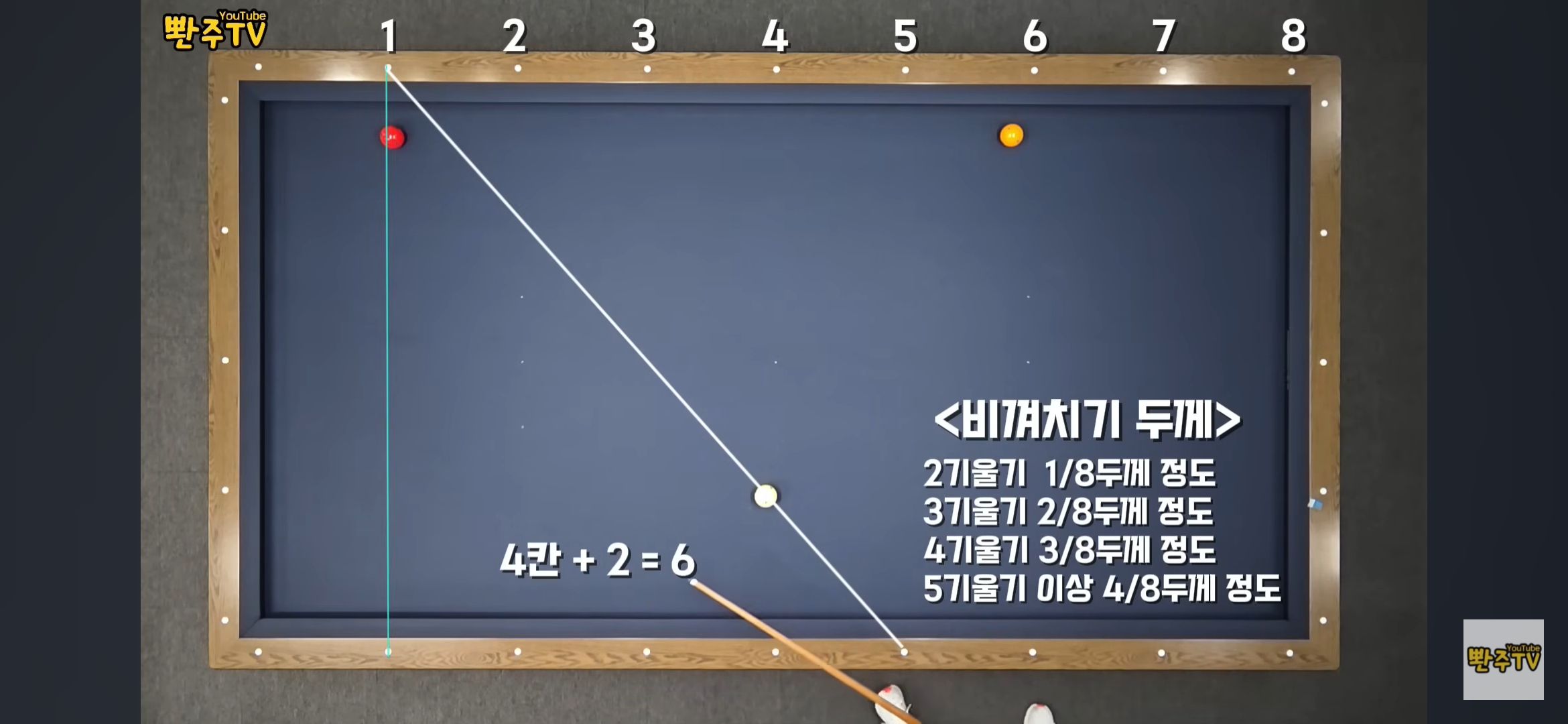 이론을 알았으면 이제 실전 적용입니다. 기울기 칸수에 따라 수구가 어디로 가는지 패턴을 익혀두면, 당구대 위에서 일일이 계산하지 않아도 한눈에 코스가 보입니다. 예를 들어 6칸 기울기는 +1 해서 7에 도착하고, 7칸 기울기는 8에 도착합니다. 8칸 기울기는 9로 가는데 이 경우 코너보다 길게 나가므로 주의가 필요합니다.