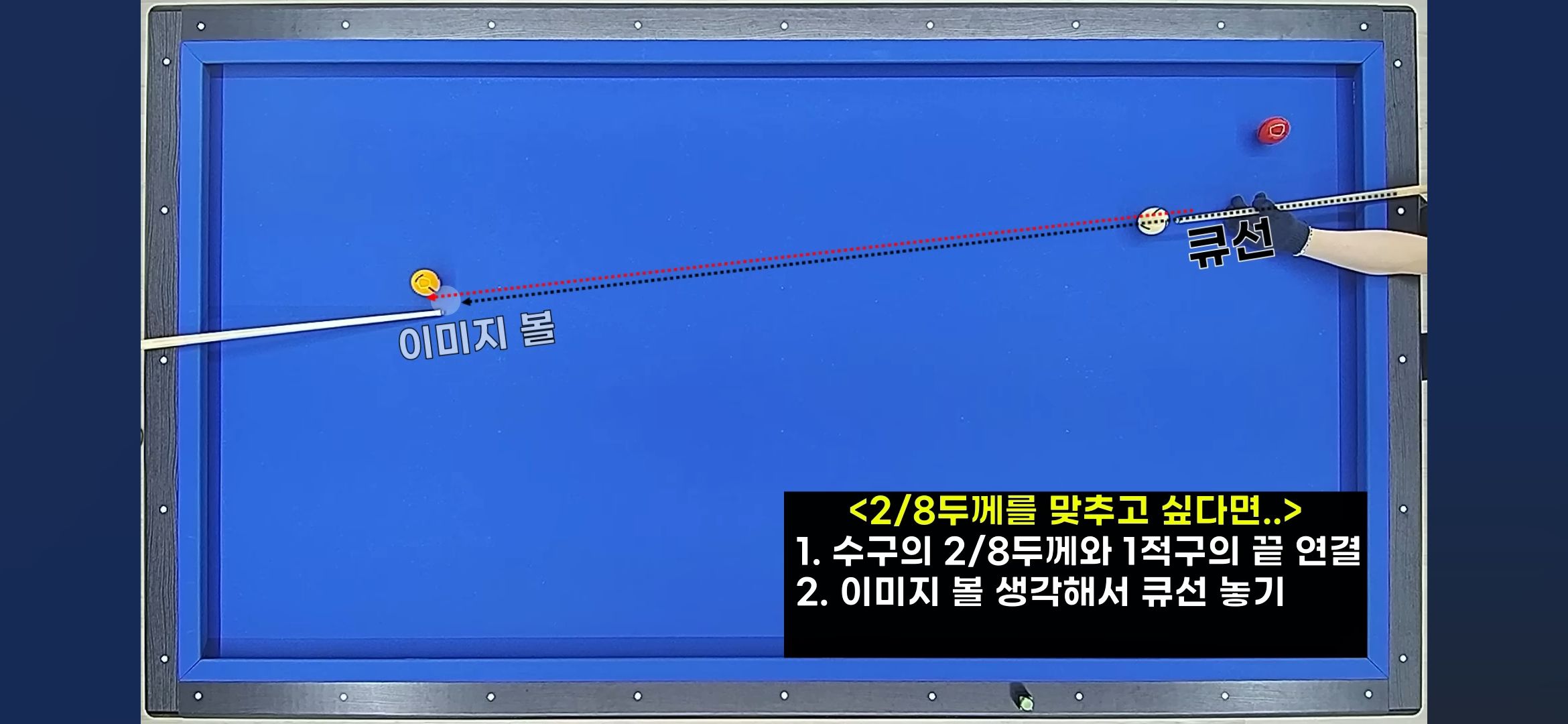 '이미지볼(Image Ball)'이란 수구가 적구와 접촉하는 순간 수구가 위치할 가상의 공을 머릿속에 그려보는 기법입니다. 쉽게 말해 적구 뒤에 투명한 수구를 하나 더 놓고, 그 투명한 공의 중심을 향해 실제 수구를 보낸다고 생각하는 겁니다. 이렇게 하면 추상적이던 '두께'라는 개념이 구체적인 '목표 지점'으로 바뀌면서 큐선을 정확히 잡기 쉬워집니다.