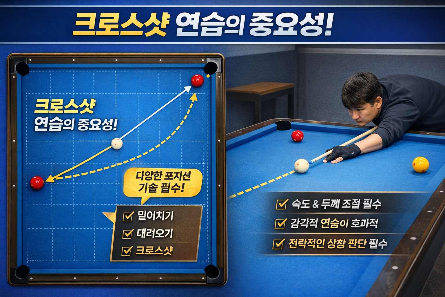 솔직히 말하면 저는 당구를 치면서 한동안 밀어 치기만 믿고 살았습니다. 포지션이 조금만 애매해져도 무작정 밀어 치기로 해결하려다 보니 다음 공이 어려워지는 일이 잦았습니다. 그러다 동호회 선배가 "크로스샷 타이밍 좀 연습해 봐"라고 조언해 준 뒤로 생각이 달라졌습니다. 크로스샷은 공 배치가 완벽하지 않을 때 선택할 수 있는 유용한 기술이고, 실제로 익혀두면 경기 운영 폭이 확 넓어집니다.