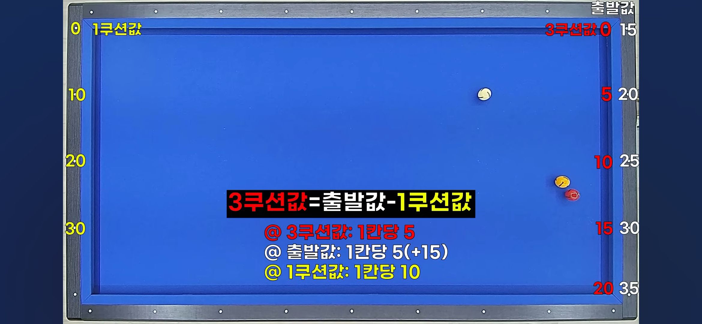 계산식은 '도착(쓰리쿠션 값) = 출발 - 원쿠션 값'으로 통일됩니다. 여기서 쓰리쿠션 값이란 세 번째 쿠션에 공이 도착하는 지점을 의미하며, 코너 제로 기준으로 한 칸 당 5씩 증가합니다. 출발 값은 쿠션 값에 +15를 더해주고, 원쿠션 값은 한 칸 당 10으로 설정합니다. 모든 값은 프레임 단위로 계산하며, 프레임과 날의 경계를 기준점으로 삼으면 됩니다.