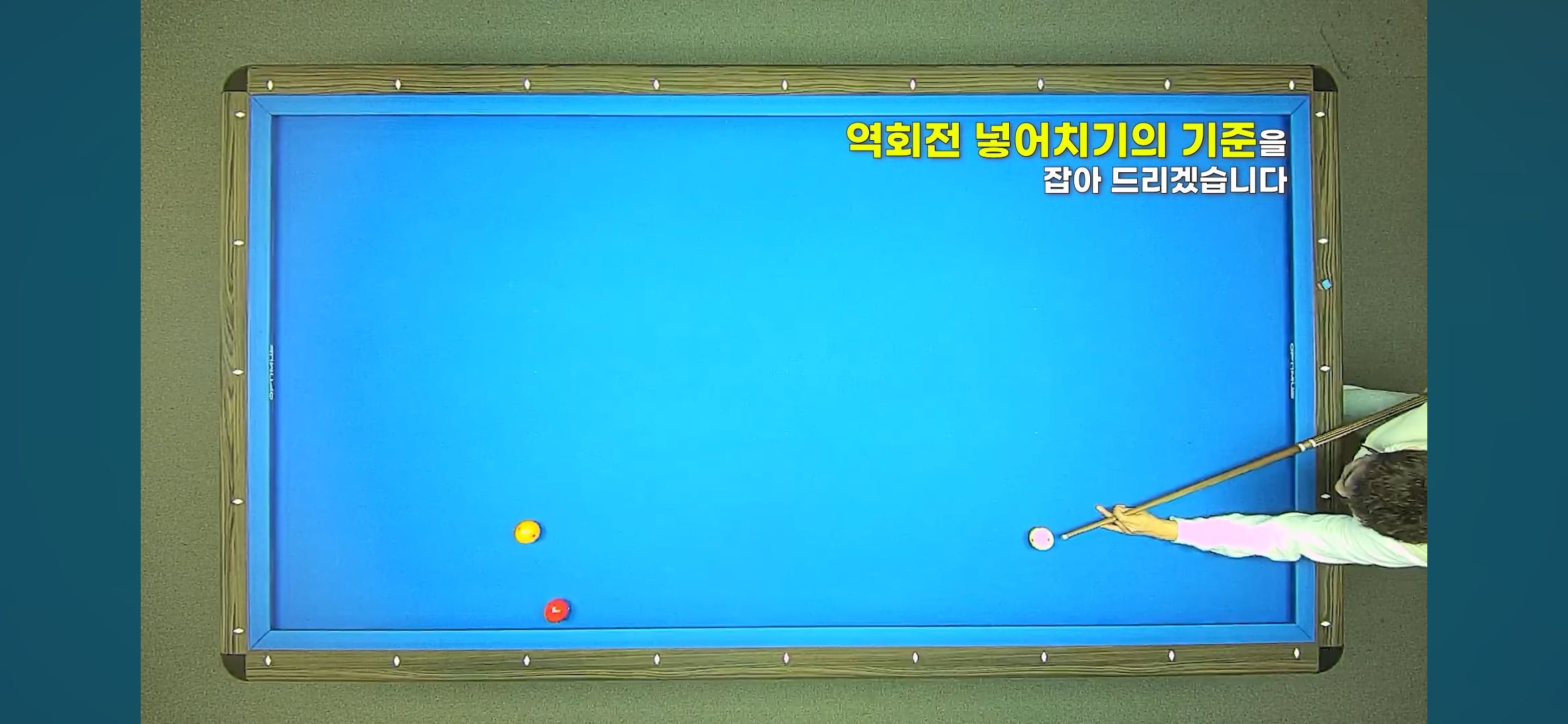 역회전 넣어치기의 설계는 생각보다 단순한 기준에서 출발합니다. 수구와 1적구가 장쿠션 포인트에서 각각 떨어진 거리를 확인한 뒤, 그 간격의 절반 지점에 해당하는 쿠션 날을 첫 쿠션 목표 지점으로 설정하는 방식입니다. 예를 들어 수구와 1적구가 장쿠션 포인트 기준으로 5칸 떨어져 있다면, 2.5칸 앞 쿠션 날을 향해 겨냥합니다.