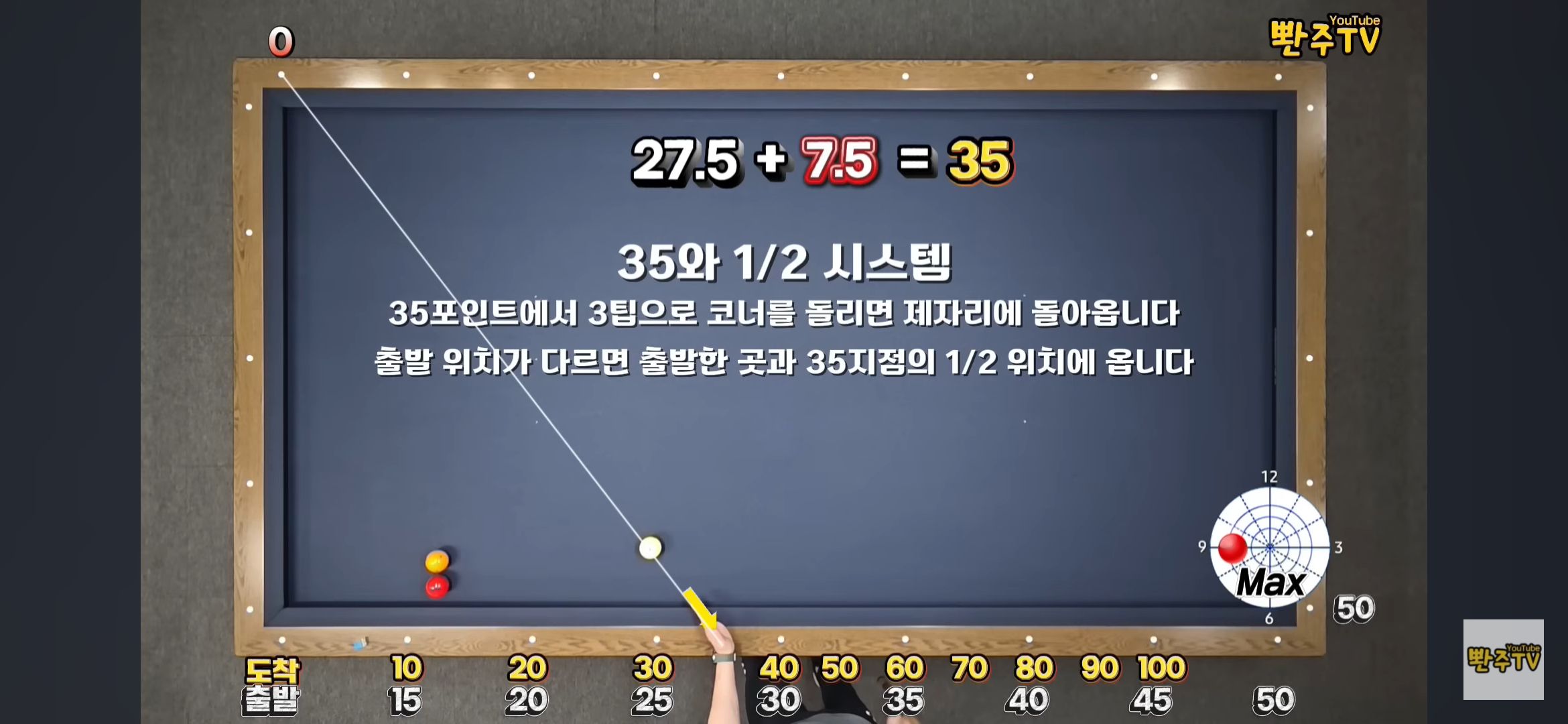 여기서 중요한 개념이 뱅크샷(Bank Shot)입니다. 뱅크샷이란 수구가 목적구를 직접 맞히지 않고 쿠션을 먼저 활용해 간접적으로 득점을 노리는 방식을 말합니다. 35 이상 긴 출발에서는 이 뱅크샷 개념과 맥스 7.5가 결합될 때 득점 범위가 예상보다 크게 확장됩니다.